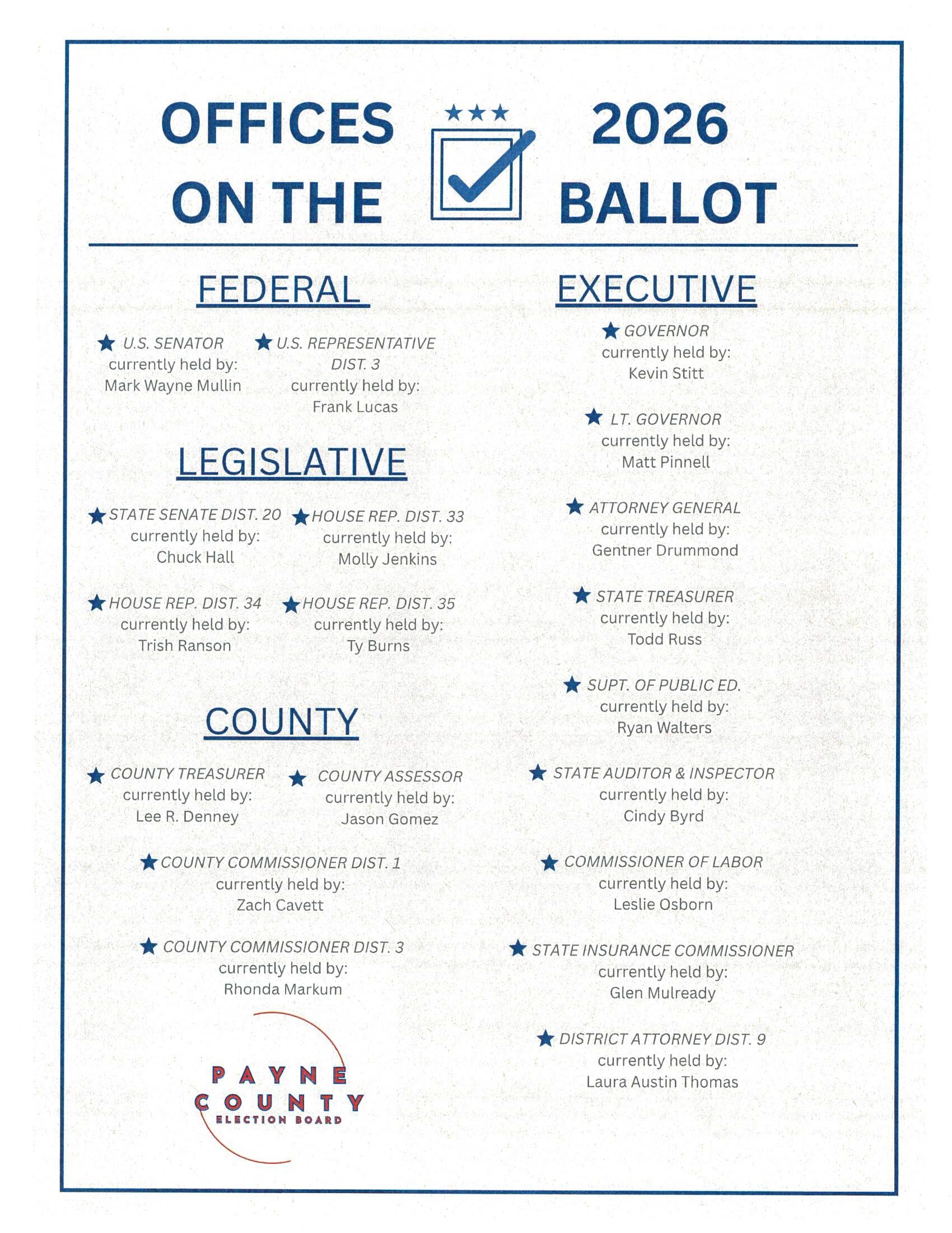 The Payne County Election Board, under the supervision of the Oklahoma State Election Board, conducts elections for all Federal, State, County, local school, and local municipalities for Payne County voters.